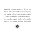 Affirmation: “My wish is to receive a miracle. To trust and believe in the invisible forces working with me, helping to bring my desires into reality. To open my eyes to all of life’s daily miracles, big and small, to be present and open to witness it all. I believe in miracles.“