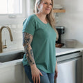 Relaxed fit, shoulder-less arm, chest pocket and contoured hem are just a few reasons why this shirt is so beloved! It's perfect all year round with shorts, jeans, leggings...whatever!
