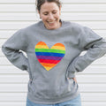 This sweater features a brilliant Quilted Rainbow Heart on a Heather Grey Sweater. Each heart is stitched onto a unisex cotton polyester sweater. Amanda {first picture} is wearing a Large & Carissa {second picture} is wearing a Small.