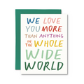 Express your boundless love with this "We Love You More Than Anything In The Whole Wide World" card! Perfect for anniversaries, birthdays, or just because, this card delivers a heartfelt message with a playful, colourful design. The blank interior allows you to pour your heart out with a personal message, sharing your deepest feelings with someone special.