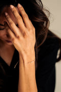 Woman wearing a delicate bracelet on her wrist with a neutral background